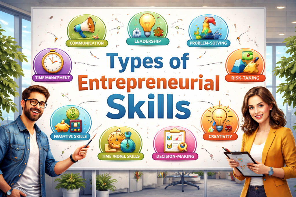 Entrepreneurial skills are the abilities that help a person start, manage, and grow a business successfully. These skills are not only useful for business owners but also helpful in daily life, jobs, and personal growth.
