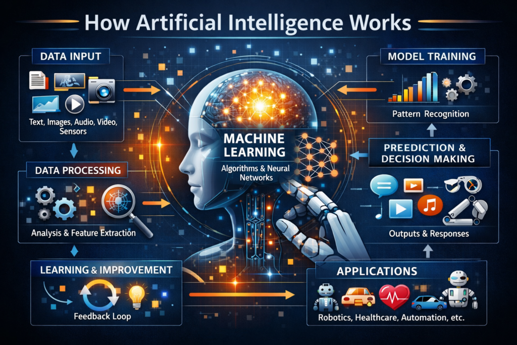 Artificial intelligence works by combining large amounts of data with powerful algorithms. These algorithms allow computers to process information, identify patterns, and make predictions.